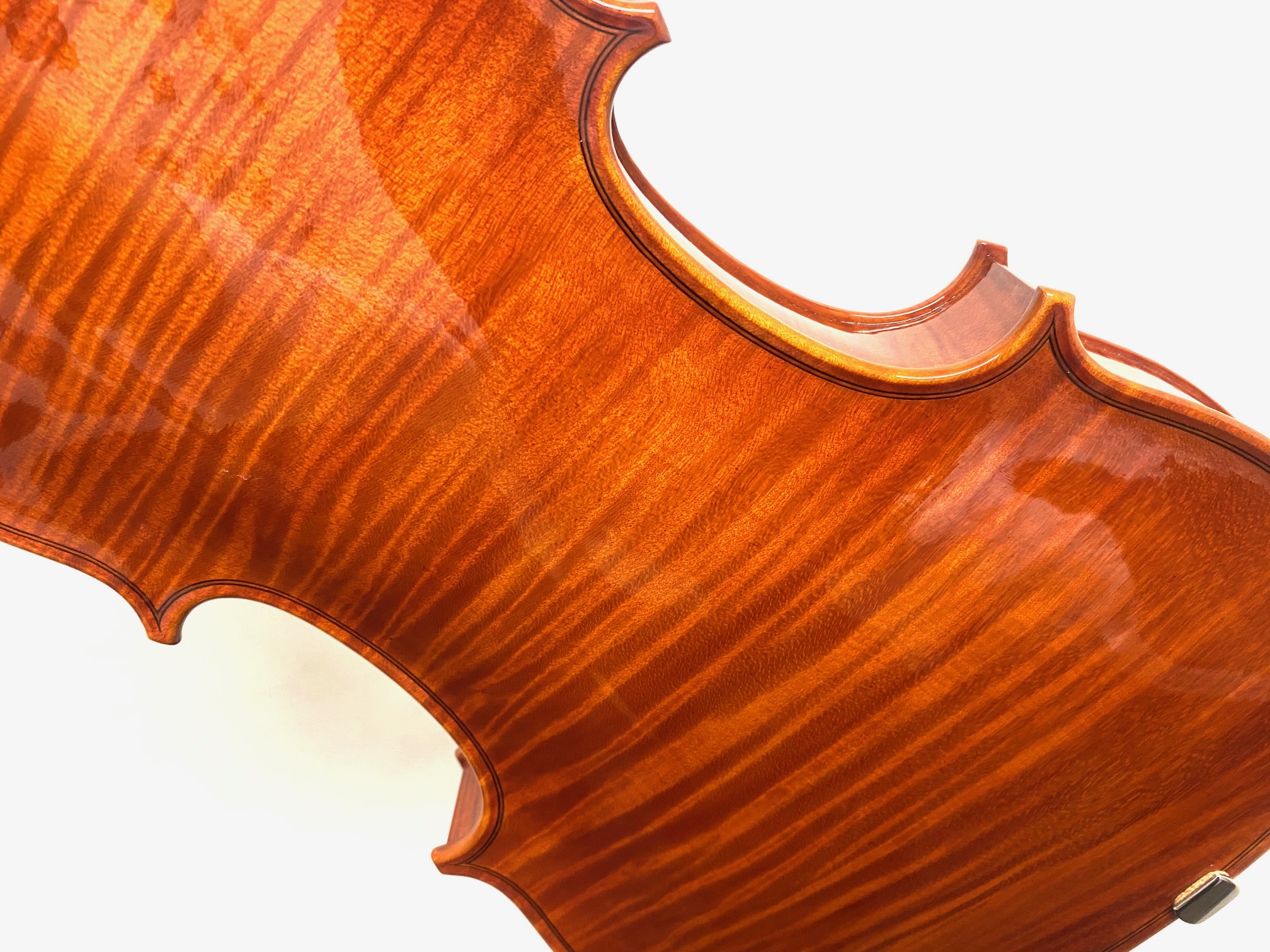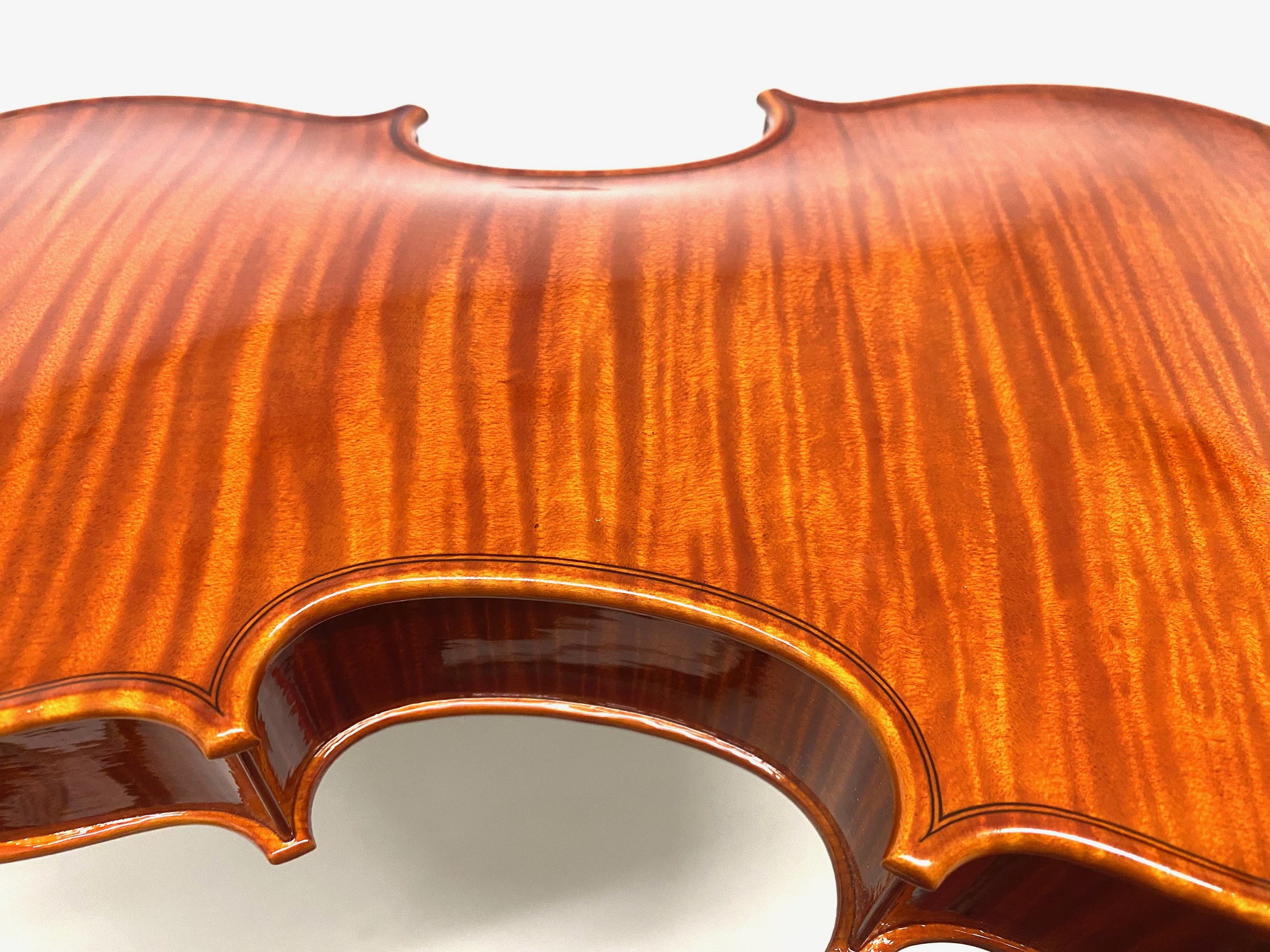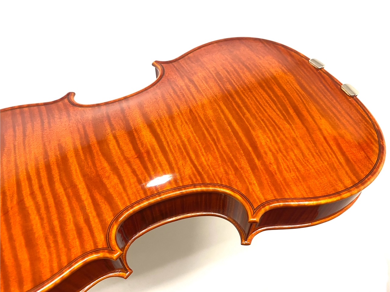 その最新作ヴァイオリンが山野楽器に届きました。イタリアンヴァイオリンで最も人気があるシメオーネの ヴァイオリンは購入することは難しく、入手も困難とされています。 今回シメオーネ・モラッシー氏と山野楽器の深い関係から、託していただけることになりました。 モデルは、ストラディバリ。名器とされた作品をモデルとしています。 その圧倒的な迫力ある杢の裏板、美しく精微な作り。まさに極上の逸品と言えるでしょう。